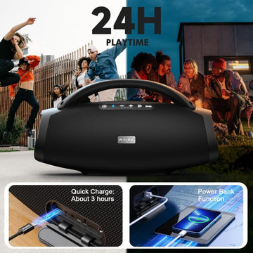 Thanks to the large battery, your portable speaker can play for up to 24 hours on a single charge.