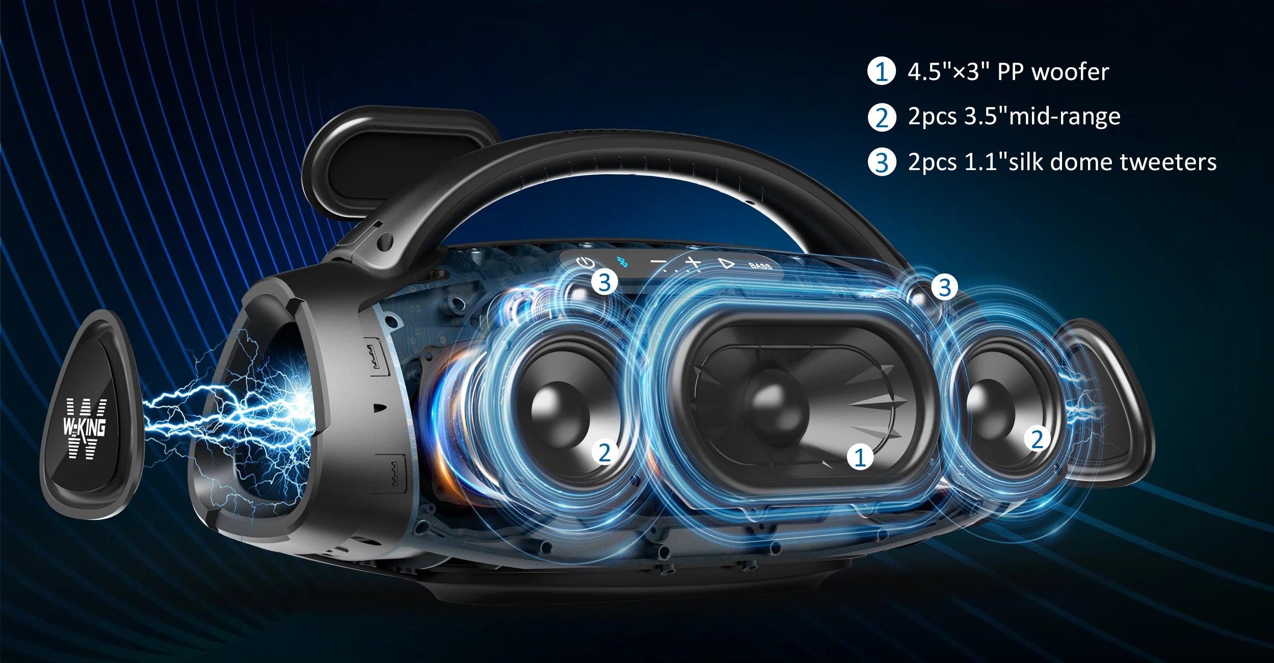 The W-KING X20 speaker features a customizable equalizer (EQ) via the W-KING app, allowing real-time adjustments to bass, treble, and mid-range frequencies. This ensures an optimal listening experience tailored to your preferences.