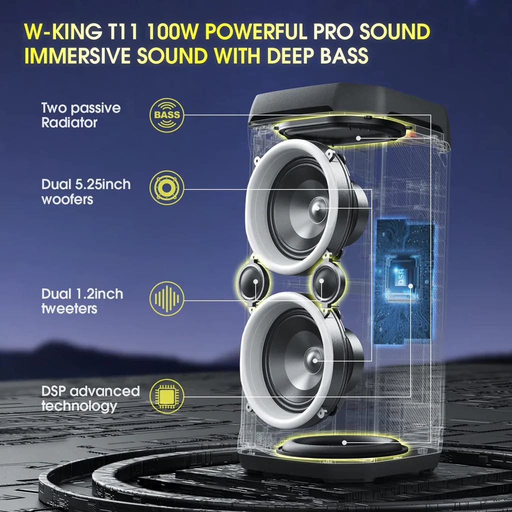 W-King T11 is a powerful and portable Bluetooth speaker, designed to deliver exceptional sound quality wherever you go. With 100W power output, it provides deep bass and clear, rich sound that fills any space, making it perfect for parties, outdoor adventures, or indoor listening.